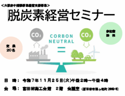 ・中小企業の脱炭素化に向けた国の動向と関西地域の取組について・大阪府の脱炭素経営に関する支援策の説明・CO2排出量可視化・SBT認証取得の重要性について【日時】令和7年11月25日(火)午後2時~午後4時【会場】富田林商工会館 2階 会議室(富田林市粟ヶ池町2969-5)...